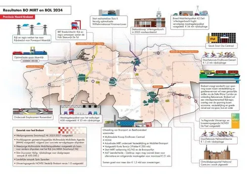 Visuele weergave van de provincie Noord-Brabant: Een overzicht van alle voor Brabant relevante afspraken die in Den Haag zijn gemaakt tijdens het BO MIRT en het BOL: het Bestuurlijk Overleg Leefomgeving.