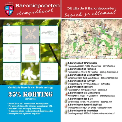 Bezoek zes van de negen prachtige Baroniepoorten en ontvang maar liefst 25% korting bij een deelnemende Baroniepoort naar keuze bij een besteding van maximaal 100 euro!Bij besteding van 10 euro krijg je al een stempel.